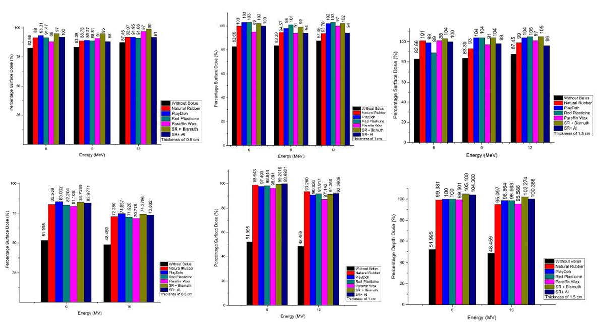 Figure 5 contains all data on the percentage of surface dose irradiated by both electron and photon beams. It can be observed that all the synthesized boluses could increase the dose to the surface for all energies of both electron and photon beams as well as for all bolus thicknesses in compared to without boluses. The increasing value of the PSD for electron beam energy ranges from 6-20%, while photon energy is even more significant, namely around 30-50%.