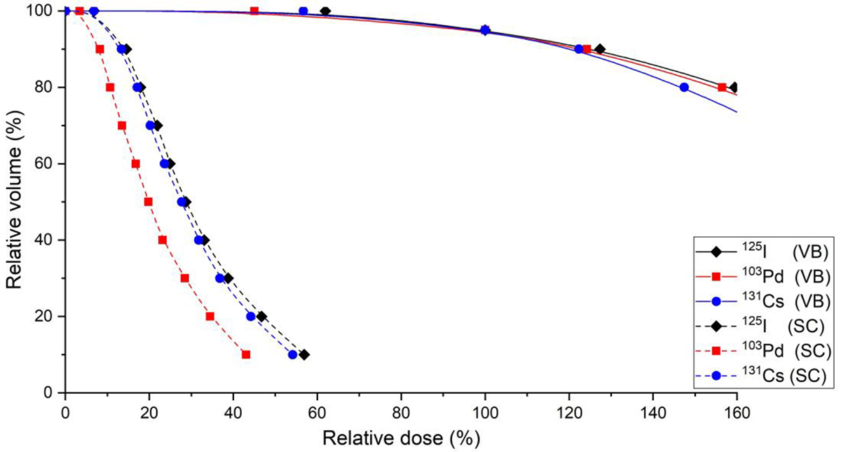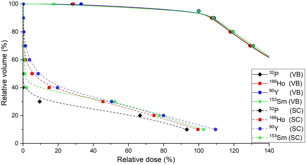 Figure 3. The vertebral body (VB) and the spinal cord (SC) dose-volume histograms obtained by simulating radioactive bone cement loaded with several radioisotopes to be used in the vertebroplasty approach.