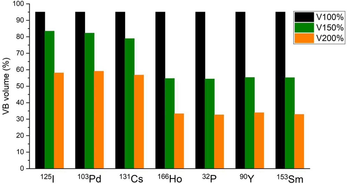 The minimum dose covered 95% of the VB (VB D95%), the minimum dose of the VB (VB Dmin), the minimum dose delivered to 90% of the SC (SC D90%), and the maximum dose of the SC (SC Dmax), in terms of pico-gray per particle are tabulated in Table 3. A representative comparison of V150% (the VB volume received at least 150% of the reference dose), and V200% parameters are shown in Figure 5. Note that the V100% is 95% for all radioisotopes due to the definition of the reference dose (D95%) in this simulation. One should be careful about the occurrence of cold spots in dose distribution. As inferred from Table 3, the ratio of D95% to D100% of the VB reaches up to 161%, 221%, 176%, 353%, 349%, 303%, and 565% for 125I, 103Pd, 131Cs, 32P, 166Ho, 90Y, and 153Sm, respectively. From another perspective, the minimum “mean” dose covered 100% of the VB was 62.0%, 45.0%, 56.5%, 28.3%, 28.6%, 32.9% and 17.7% of the reference dose for 125I, 103Pd, 131Cs, 32P, 166Ho, 90Y, and 153Sm, respectively. The term mean is referred to the average of two separate simulations performed for each radioisotope. Therefore, the occurrence of cold spots in the dose distributions of the cement mixed with 153Sm is more probable. However, the presence of cold spots is not significant for 125I and 131Cs seeds, provided that a maximum inter-seed space of 10 mm is maintained on each plane.