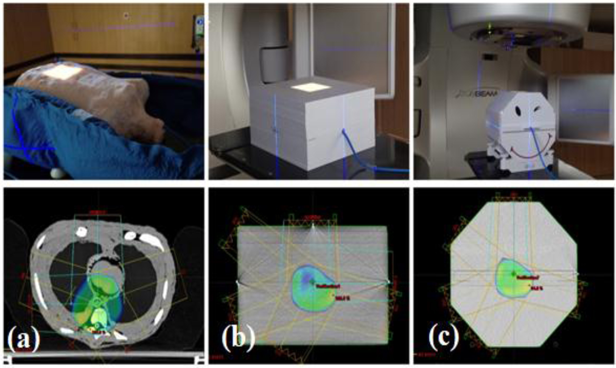 Figure 1. Pictorial representation of the experimental setup of (a) indigenous heterogeneous thoracic, (b) slab, and (c) Octavius phantoms on the TrueBeamlinac