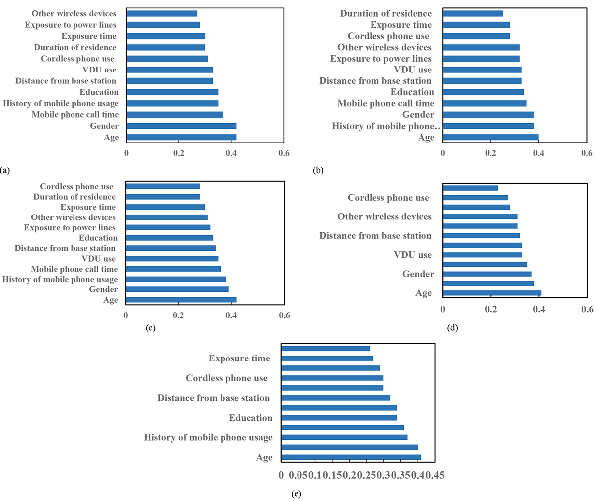 Figure 1. Relative Importance of Attributes for Subjective Health Symptoms Prediction Models Estimated Using RF Model. (a) headache; (b) dizziness; (c) sleep disturbance; (d) fatigue (e) vertigo. (RF: Radiofrequency, VDU: Video Display Unit)