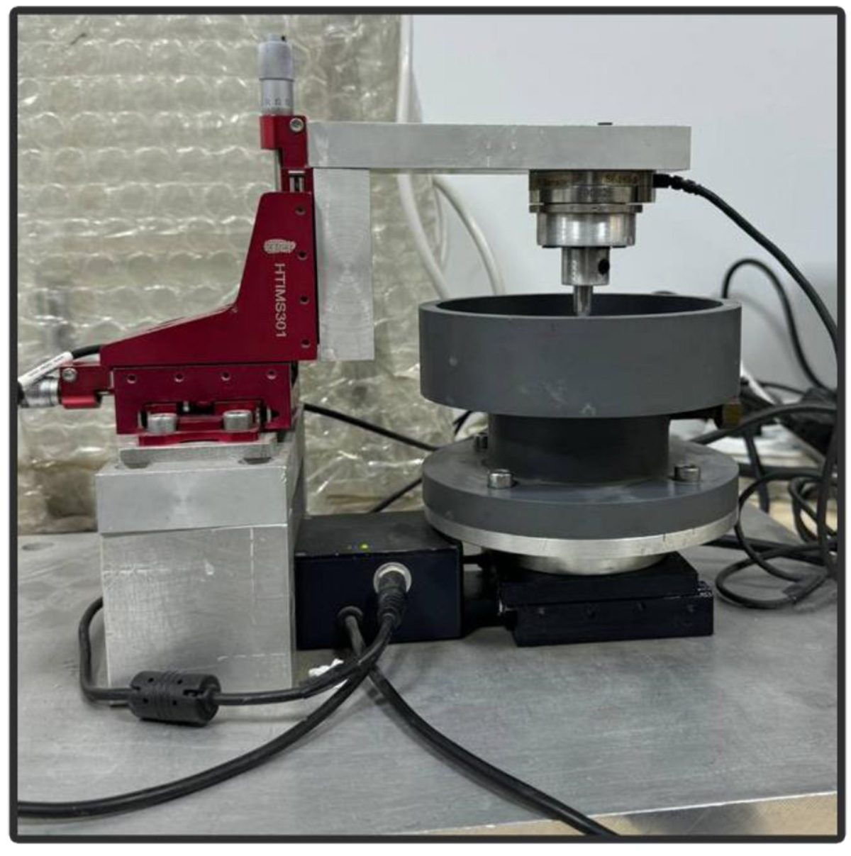 The initial stages of the experiment involved connecting the technological apparatus to the computer, which housed the analysis software, and preparing it for use. The pin was prepared and cleaned using a dry cloth and acetone, and then it was installed in the specially designed apparatus. The next step was to modify the Zaber console script to apply specific criteria to each oscillating friction cycle. The selected parameters included a sliding setup with a distance of 6 mm, 100 sliding oscillating cycles totaling 600 mm, and a 5-minute run at a speed of 2 mm/sec. A load of approximately 10 N was applied to the specimens, which is similar to the ideal force for orthopedic applications [ 20 ]. To conduct a tribological frictional test that mimics the conditions in the human body, the six specimens and the pin were immersed in the SBF, as shown in Figure 3 [ 21 ]. In this study, we used a total of three uncoated Ti-6Al-4V substrate discs and three Ti-6Al-4V substrate discs coated with HAp+SiO2. To minimize methodological variations and enhance the validity of the results, each specimen underwent three friction cycles, and the results were averaged. In total, 18 friction cycles were conducted and analyzed as part of this study.