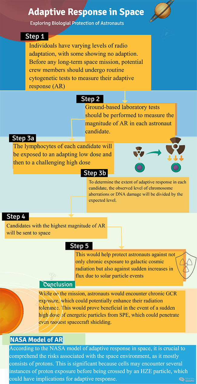 Figure 2. According to methods suggested by Mortazavi et al., before long-duration space missions, astronauts’ lymphocytes could be exposed to controlled low or adapting/priming doses of radiation (in vitro). This pre-exposure would be done before exposure to a large or challenging dose to evaluate the magnitude of adaptive responses in each candidate. This in vitro test could help the selected astronauts’ bodies better handle the higher levels of cosmic radiation or large solar particle events encountered in space.