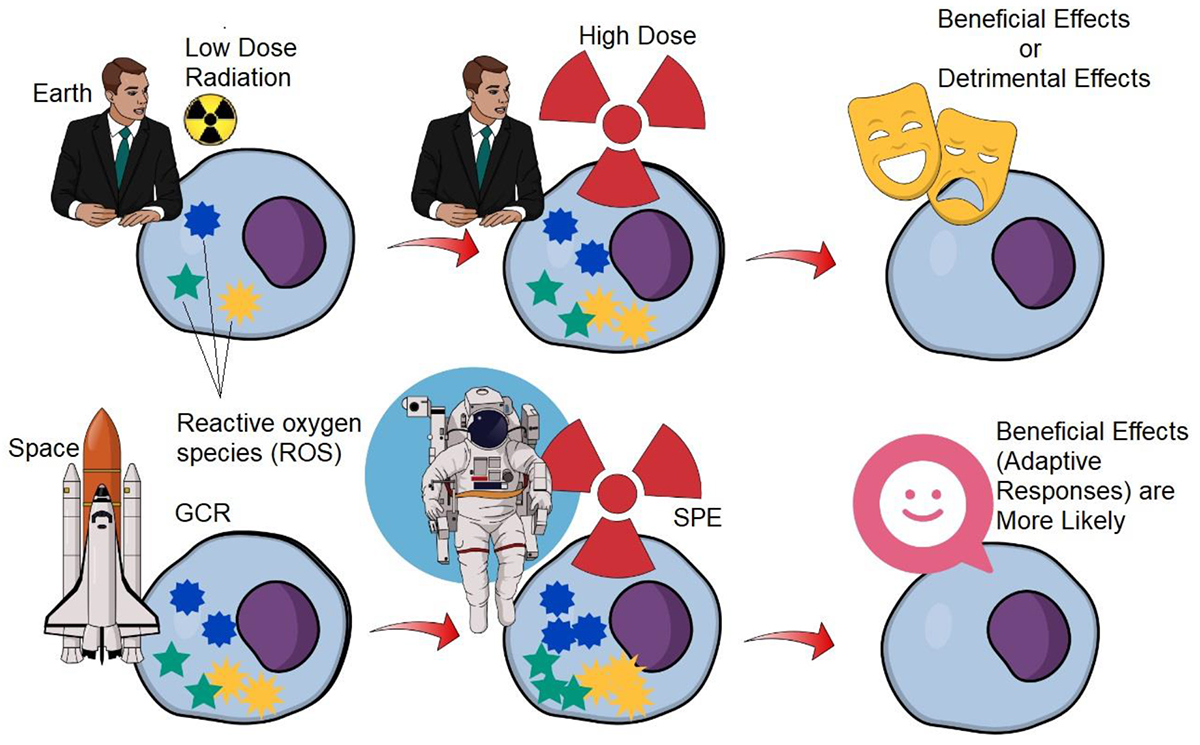 While this hypothesis is supported by scientific principles and studies, it simplifies the complex effects of radiation on biological systems. Space radiation, a mix of high-energy protons, heavy ions, and secondary radiation, is a unique challenge not directly comparable to terrestrial radiation. Additionally, while ROS might help with radiation adaptation, they can also cause DNA damage and cell death, highlighting their dual role as both beneficial and harmful agents.