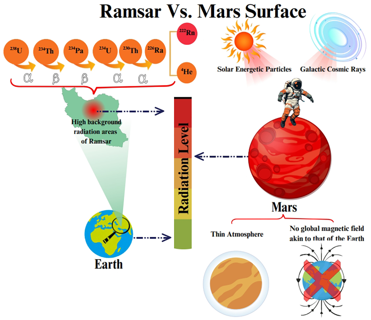 Ionizing radiation, originating from the sun and other celestial sources, poses a significant threat to humans on Earth and other planets, such as Mars. On Mars, the thin atmosphere and weak magnetic field allow these ionizing rays to easily penetrate the planet’s surface, potentially endangering human inhabitants. The radiation dose on Mars’ surface can vary, but it typically is much higher than the dose deemed safe for humans on Earth. While Mars’ thin atmosphere and weak magnetosphere expose it to high cosmic radiation levels (around 240 millisieverts per year), some places on Earth actually have even higher background radiation. Ramsar, Iran, holds the record for the highest annual radiation dose from natural sources, with some areas reaching a staggering 260 millisieverts per year (Figure 1).