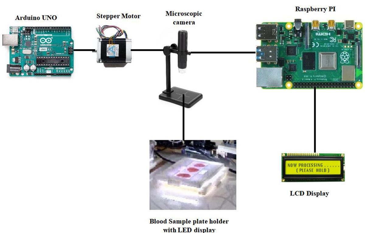 The blood cell smears were collected by the trained professionals from the patients’ fingerprints and reagents were added with the following standard procedure from COSMOPOLIS Hospital, Ashok Pillar. The proposed IoT-enabled imaging system identifies the patient’s blood group automatically. The 40x to 1000x magnification microscopic camera is connected to an Arduino UNO for motor actuation and a stepper motor for the camera’s forward and backward movement. The slide is placed in the blood slide holder with an LED (Light-Emitting Diode) Display. The camera is connected to Raspberry PI, and the blood smear images were stored in the computer for further processing. MATLAB (Matrix Laboratory) is a programming and simulation environment widely used in engineering, scientific computing, and image processing applications. It provides built-in functions and toolboxes for image processing, machine learning, and data analysis. OpenCV (Open Source Computer Vision Library) is a high-performance library for real-time image processing and computer vision applications. Because of their speed and versatility, both are frequently utilized in medical imaging. The features extracted for blood group identification and detection are performed using MATLAB, and Open CV software, and the blood samples are compared using image processing, and the results of testing can be obtained through the simulation software. The final result after the identification of the blood group using our proposed method will be displayed in the 16×2 LCD (Liquid Crystal Display) alphanumeric display. Figure 1 shows the overall block diagram for the automatic prediction of the blood group from the blood smear images. The blood group is predicted and displayed with an alphanumeric LCD connected to Raspberry Pi.