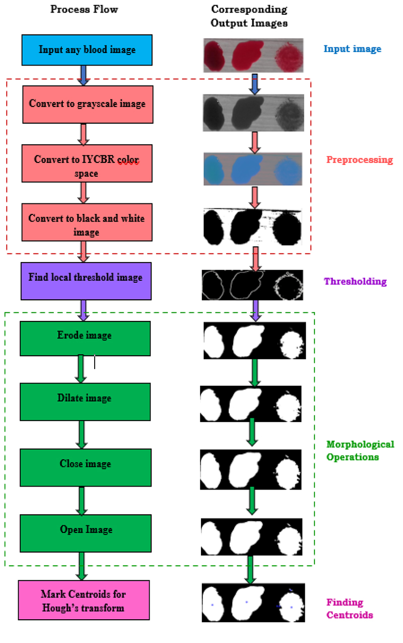 Figure 2. Process flow chart for finding the centroids in blood smear images for blood group identification