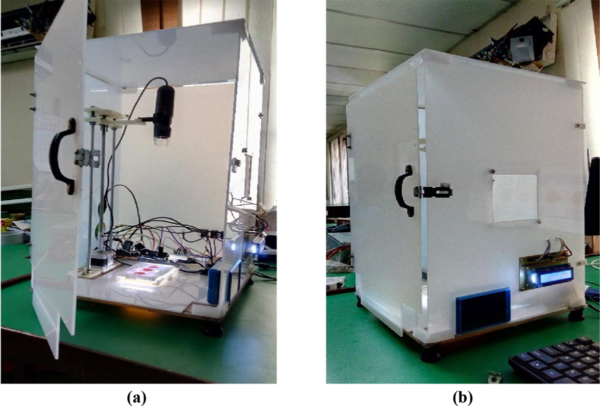 After processing all edge points in the image, the accumulator will contain peaks at (ρ,θ) values, where many lines intersect, i.e., these peaks represent strong candidates for lines in the image [ 22 ]. After the voting procedure, the peaks in the accumulator array indicate the most likely parameters (ρ,θ) for the lines in the image. By detecting the peaks in the accumulator array that correspond to the most prominent lines. These peaks correspond to the strongest candidate lines, which can be extracted and drawn back onto the original image [ 23 ]. The maximum and minimum points were identified for separating antigens, and the centroid was identified from the calculated radius [ 24 ]. Table 1 shows the threshold levels for 8 different blood groups and the antigen values for determining the blood group. Figures 4 (a) and (b) show the model designed and fabricated at the Department of Production Technology, MIT Campus, Anna University for blood group identification.