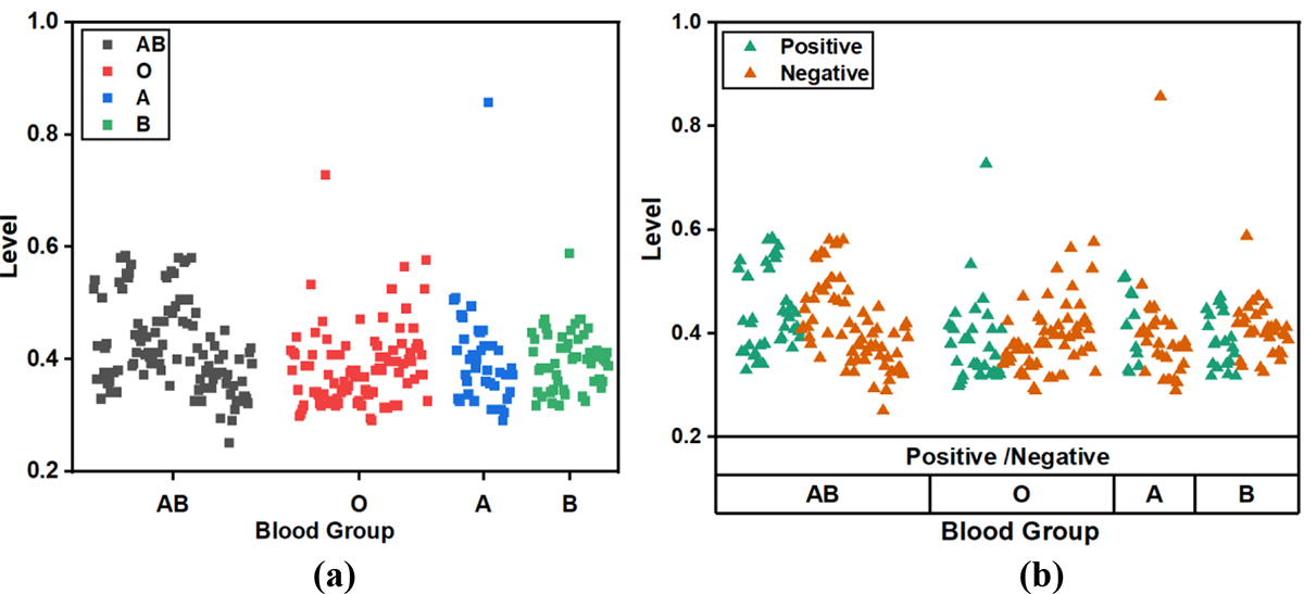 This section summarizes the system’s experimental results of the automated blood group identification system with the results of 303 participants. The provided values correspond to the results of analyzing 303 blood smear images after converting them to grayscale and applying a threshold of 0.5. Figures 5(a) and (b) show the scatter plot of the predicted blood groups from blood slides using a fabricated device. Figure 5(a) shows the scatter plot of detected blood groups and their corresponding calculated threshold level. Figure 5(b) shows the scatter plot of detected blood groups with Rh factor for the determined blood group and their calculated level of threshold for each blood group.