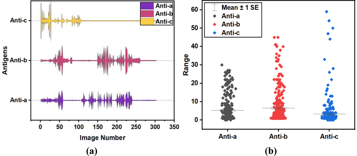 Figure 6. Antigen range distribution for input blood smear images (a) Kite plot separating Antigen a, b, and c (b) Scatter plot of images (mean ± standard error) after applying Antigen ‘a’, ‘b’ and ‘c.’