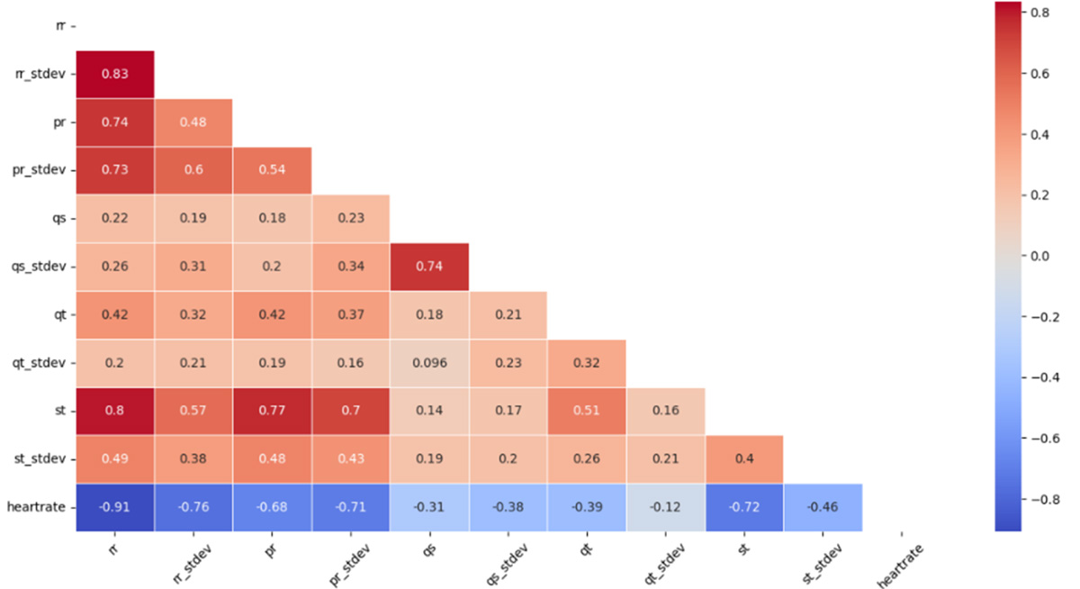 For example, a strong positive correlation was observed between the standard deviations of the RR and ST intervals, suggesting a shared variability in these measures. Additionally, the standard deviations of the PR and RR intervals also showed a strong positive association, which raises the possibility of common regulatory mechanisms governing these intervals. The heatmap further highlighted consistent patterns, with a strong positive correlation between QS intervals and their respective deviations, as well as between ST and PR intervals. Conversely, a negative correlation between heart rate and several other variables was identified, indicating a potentially unfavorable relationship. This finding warrants further investigation to better understand its implications. Future studies are crucial to elucidate the nature and significance of this negative association, particularly in the context of cardiovascular health monitoring, as emphasized in the works of [ 14 , 25 ]. Expanding on this line of research could provide valuable insights into how these physiological parameters interact and influence cardiovascular function, ultimately enhancing monitoring systems for early detection and prevention of heart-related issues.