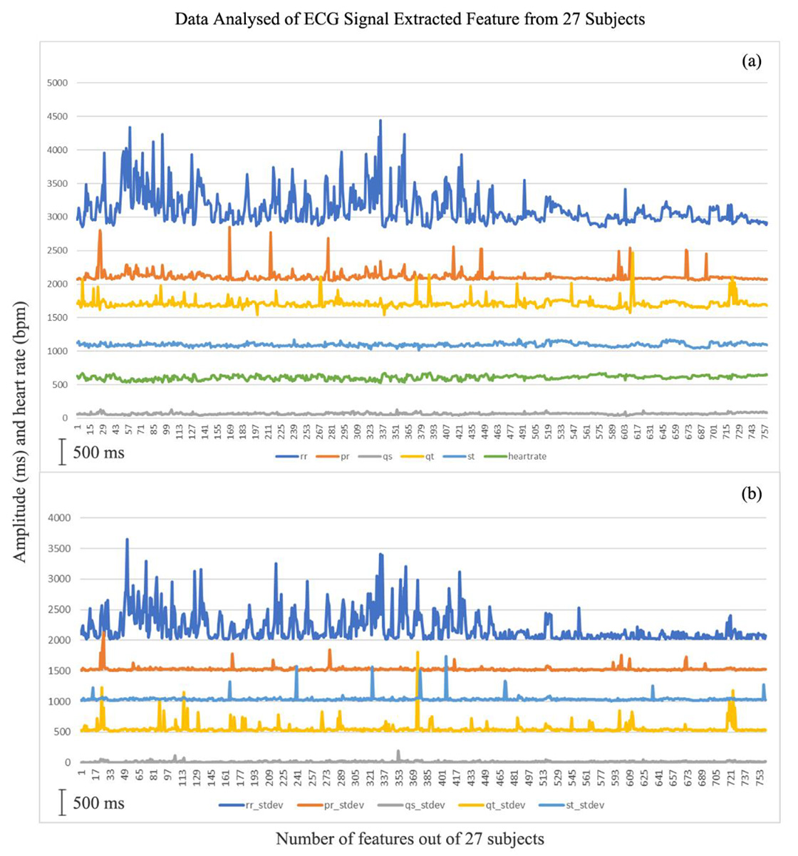 Figure 5.a) Data analyzed of Electrocardiogram (ECG) signal extracted feature from 27 subjects (blue, orange, gray, yellow, blue sky, green are RR, PR, QS, QT, ST, and heart rate intervals, respectively) b) Its standard deviation.