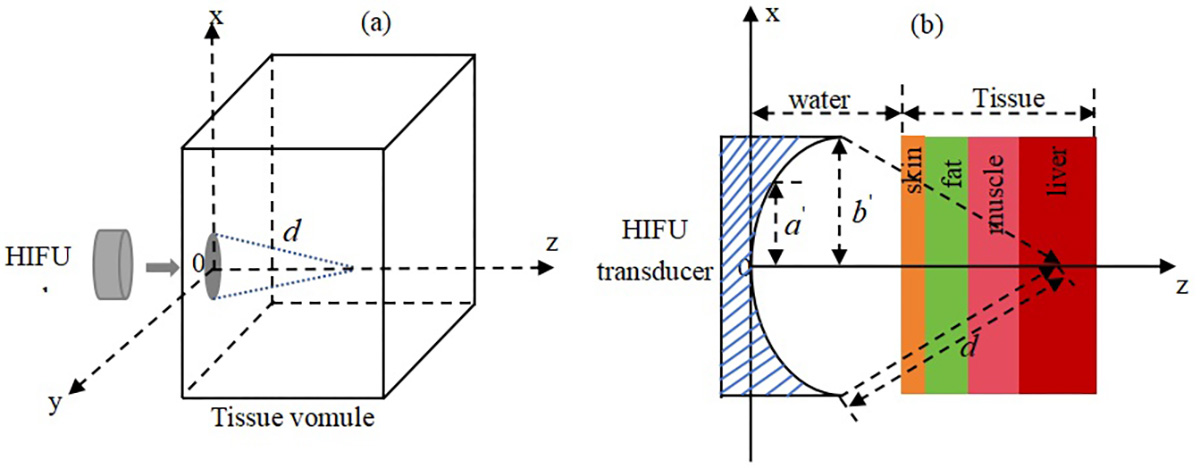 Figure 1. (a) Schematic diagram of the geometry of multi-layer biological tissue irradiated by High-Intensity Focused Ultrasound (HIFU) for simulation. (b) Schematic diagram of the ZX plane around y=0 (symmetric along the z axis)