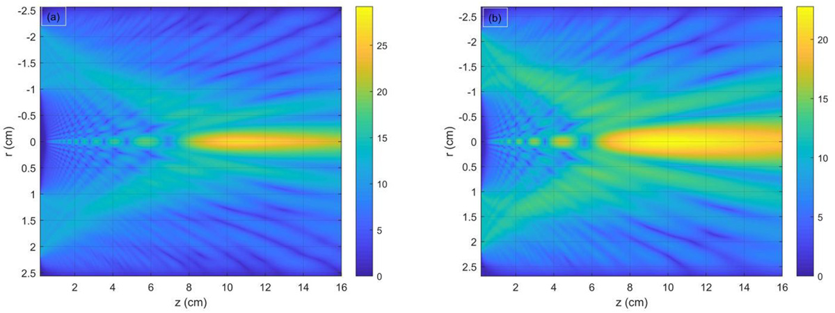 Figure 2. Comparison of sound intensity in biological tissue: (a) sound intensity generated by high-frequency ultrasound; (b) sound intensity generated by low-frequency ultrasound