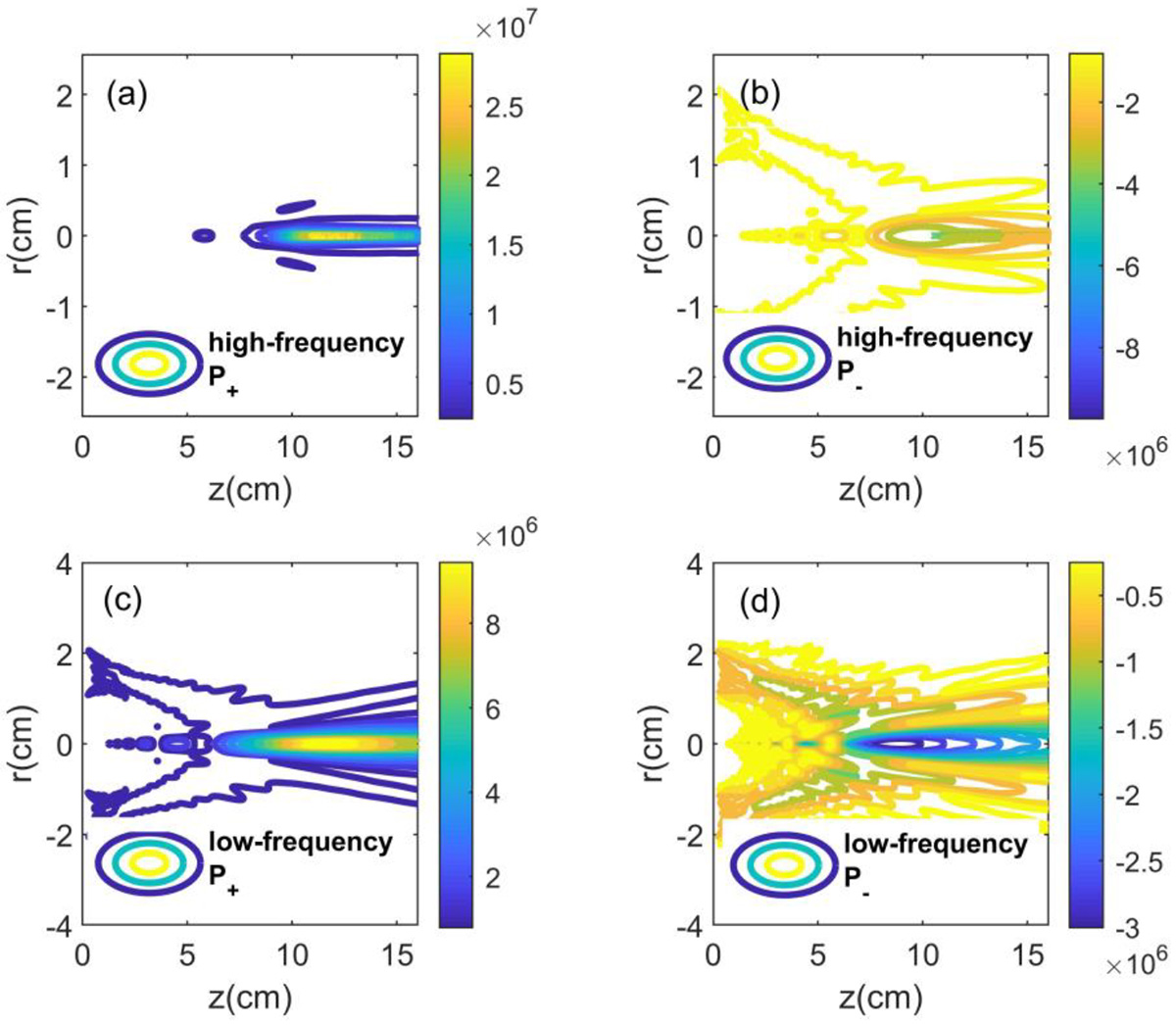 Figure 3. Comparison of positive and negative pressures in biological tissue: (a) positive pressure generated by high-frequency; (b) negative pressure generated by high-frequency; (c) positive pressure generated by low-frequency; (d) negative pressure generated by low-frequency