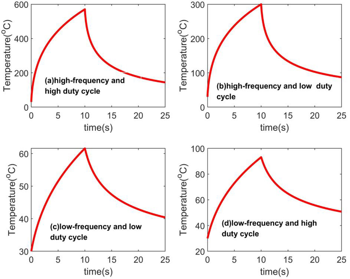 For the combination of high-frequency ultrasound and low duty cycle, high-frequency ultrasound usually has a higher frequency, a shorter wavelength, higher energy, and is easy to focus, but the penetration depth is relatively shallow [ 34 , 35 ]. Low duty cycle means that the ultrasound is “on” for a shorter time in the cycle and “off” for a longer time, resulting in lower energy output. Due to the high-frequency, when high-frequency ultrasound propagates in biological tissue, the energy is swiftly taken up and transformed into thermal energy, and the temperature at the focus will rise rapidly. However, due to the low duty cycle, the total energy output is reduced, so the temperature rise may be limited. The frequency of low-frequency ultrasound is lower, the wavelength is longer, the energy is lower, and the penetration depth is deeper when low-frequency ultrasound and high duty cycle are combined. A high duty cycle means that the ultrasound is “on” for a longer time in the cycle and “off” for a shorter time, resulting in higher energy output. Due to the long wavelength of low-frequency ultrasound, the rate at which energy is absorbed by biological tissue and converted into heat energy is slower [ 36 ], and the temperature rise at the focus is slower. However, a high duty cycle increases energy output, thereby increasing the temperature at the focus. For the combination of low-frequency ultrasound and low duty cycle, low-frequency ultrasound has a deeper penetration depth but lower energy. A low duty cycle further reduces energy output. Due to low-frequency and low duty cycle, this combination produces relatively small temperature changes at the focus of biological tissue. High-frequency ultrasound is easier to focus due to its shorter wavelength and increased energy when combined with a high duty cycle. Energy output rises with a high duty cycle. The greatest temperature rise at the biological tissue’s focus is caused by the combination of high duty cycle and high frequency ultrasound. Fast-frequency ultrasonic energy is rapidly absorbed and transformed into thermal energy, and the fast duty cycle raises the overall energy output, which causes the temperature at the focus to rise quickly.