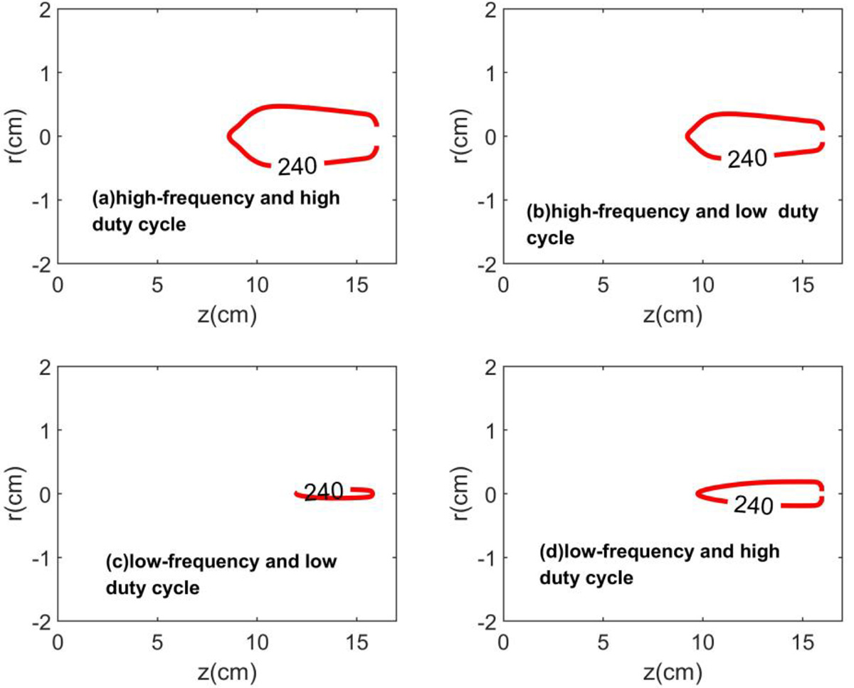 The variations in biological tissue’s focal temperature under four frequency and duty cycle combinations—high frequency and high duty cycle, high frequency and low duty cycle, low frequency and low duty cycle, and low frequency and high duty cycle—are depicted in Figure 4(a)-(d).