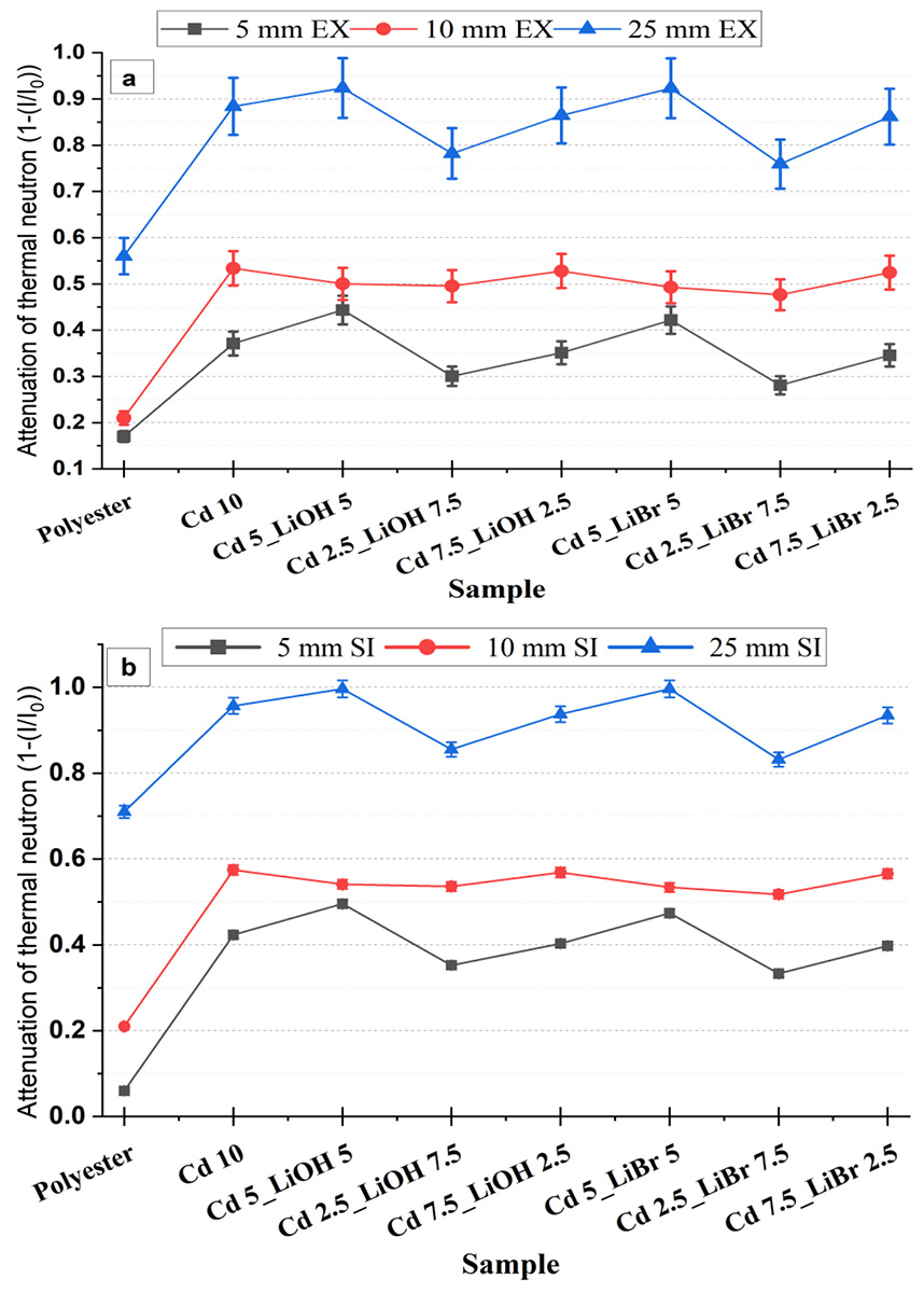 Figure 3. Neutron attenuation across various samples at three distinct thicknesses (5, 10, and 25 mm): (a) thermal neutron Experimental Data (EX), (b) thermal neutron Simulation Results (SI).