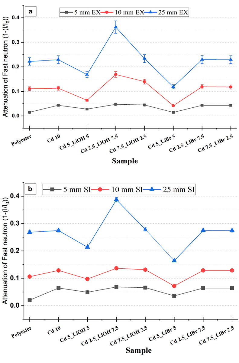 Conversely, the Cd₅_LiOH₅ composite showed the lowest performance among the composites, with simulation values of 4.879%, 9.727%, and 21.359%, and experimental values of 2.779%, 6.40%, and 16.859%, all of which were lower than the attenuation values observed for pure polyester. The average fast-neutron attenuation for all composite materials at 25 mm thickness, both in simulation and experiment, was 26.66%, representing a modest improvement over pure polyester.