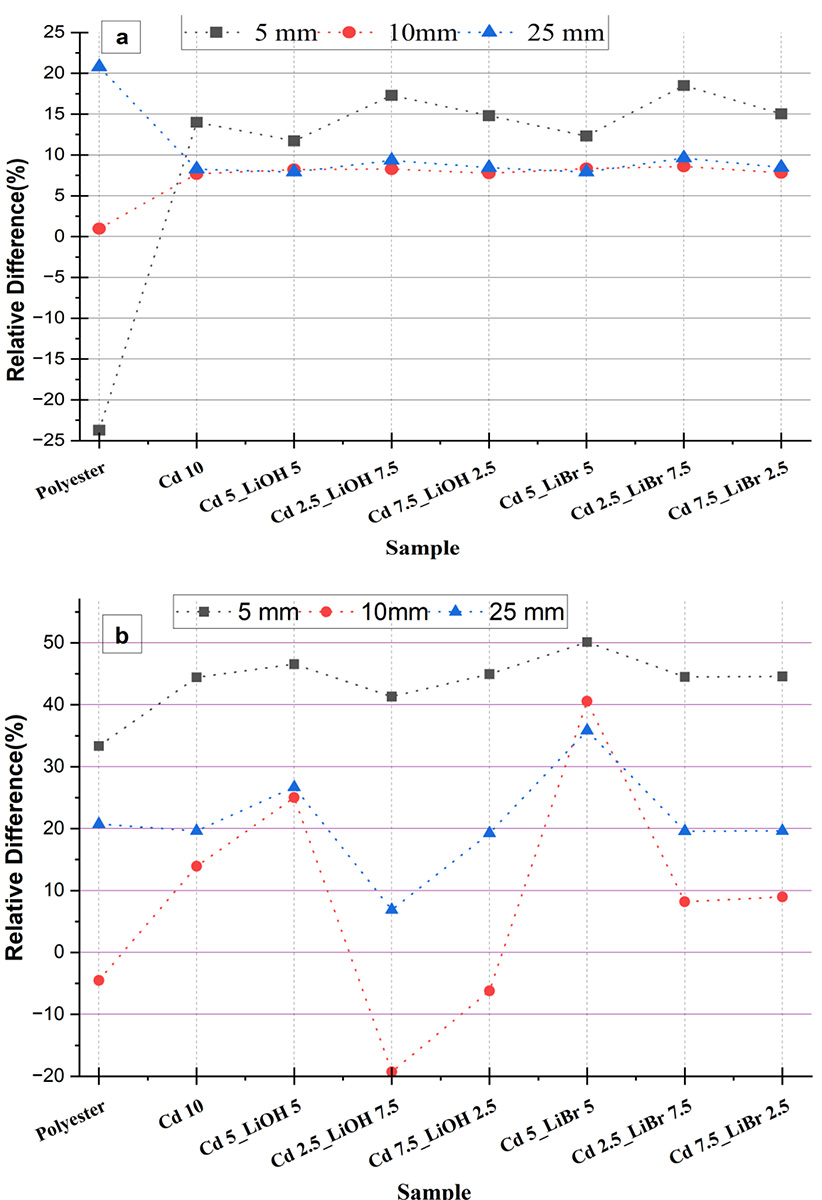 The relative differences between simulated and experimental attenuation values for thermal and fast neutrons across all materials and thicknesses (5 mm, 10 mm, and 25 mm) provide meaningful insights into the fidelity of the Geant4 model. For thermal neutron attenuation, the minimum relative difference was observed in pure polyester at 10 mm (0.98%), while the maximum occurred in the same material at 5 mm (-23.71%). Among the composites, Cd₂.₅_LiBr₇.₅ showed the highest discrepancy at 5 mm (18.51%), whereas Cd₅_LiOH₅ exhibited the lowest at 25 mm (7.90%). Overall, discrepancies were generally smaller at 25 mm, suggesting improved simulation stability in thicker materials. For fast neutron attenuation, the highest relative difference was found in Cd₅_LiBr₅ at 5 mm (50.13%), followed by Cd₅_LiOH₅ (46.57%) and Cd₇.₅_LiBr₂.₅ (44.58%). The lowest discrepancy occurred in Cd₂.₅_LiOH₇.₅ at 25 mm (6.89%). Pure polyester showed a 33.33% overestimation at 5 mm and a -4.50% underestimation at 10 mm. These findings highlight a consistent trend: simulation-experiment agreement improves with increased material thickness. Thin samples pose greater challenges due to microstructural heterogeneity and boundary sensitivity, underscoring the need for refined modeling techniques in such cases (Figure 5).