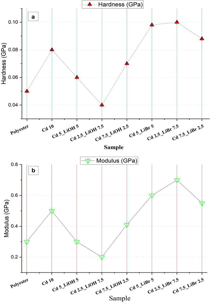 The hardness and modulus values of pure polyester and various composite materials reveal significant differences in their mechanical properties. Pure polyester exhibits the lowest hardness (0.05 GPa) and modulus (0.3 GPa), indicating its relatively soft and flexible nature. In contrast, the composites with Cd and Li additives demonstrate enhanced mechanical properties. Among them, Cd₂.₅_LiBr₇.₅ shows the highest hardness (0.1 GPa) and modulus (0.7 GPa), reflecting a substantial improvement in stiffness and strength. Cd₅_LiBr₅ also exhibits relatively high hardness (0.098 GPa) and modulus (0.6 GPa), suggesting an 85% increase in hardness. On the other hand, the Cd₂.₅_LiOH₇.₅ composite, although showing lower hardness (0.04 GPa) and modulus (0.2 GPa), still demonstrates significant improvements over pure polyester (Figure 6).