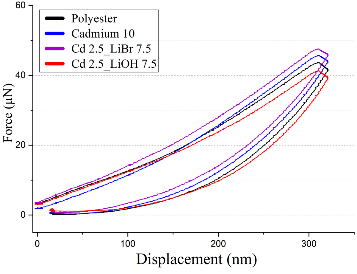 The data summarized in Table 1 compares the maximum indentation depth and maximum load for polyester, Cd₁₀, Cd₂.₅_LiOH₇.₅, and Cd₂.₅_LiBr₇.₅. The “Max Depth” column reveals that Cd₂.₅_LiOH₇.₅ exhibits the highest maximum indentation depth at 305.3 nm, followed closely by polyester at 296.3 nm, suggesting that these materials are more prone to deeper deformation under load. In contrast, Cd₁₀ and Cd₂.₅_LiBr₇.₅ show lower maximum depths, indicating greater resistance to indentation under the same load. When examining the “Max Load” values, Cd₂.₅_LiBr₇.₅ displays the highest maximum load at 59 µN, followed by Cd₁₀ at 52 µN. These results further reflect the enhanced hardness of Cd₂.₅_LiBr₇.₅, which can withstand higher loads before experiencing significant deformation. Polyester and Cd₂.₅_LiOH₇.₅ exhibit lower maximum loads of 48 µN and 44 µN, respectively, further supporting the conclusion that Cd₂.₅_LiBr₇.₅ is the hardest material in this comparison.