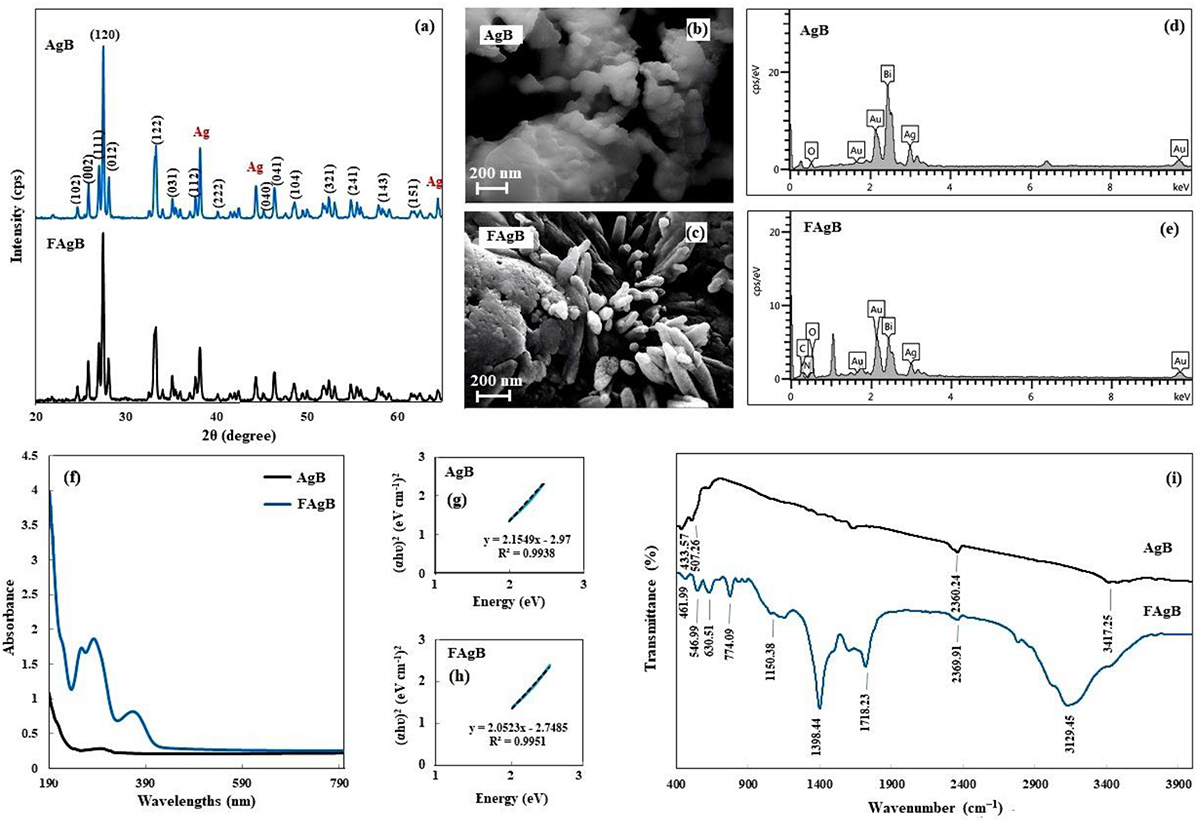 Figure 1. (a) Powder X-ray Diffraction (PXRD) spectra, (b) and (c) Field Emission Scanning Electron Microscopy (FESEM) images, (d) and (e) Energy-Dispersive X-ray spectroscopy (EDX), (f) UV–vis absorption spectra, (g) and (h) band- gap, and (i) Fourier Transform Infrared (FTIR) spectra of silver-bismuth oxide nanocomposites (AgB NCs) and folic acid-functionalized counterparts (FAgB NCs).
