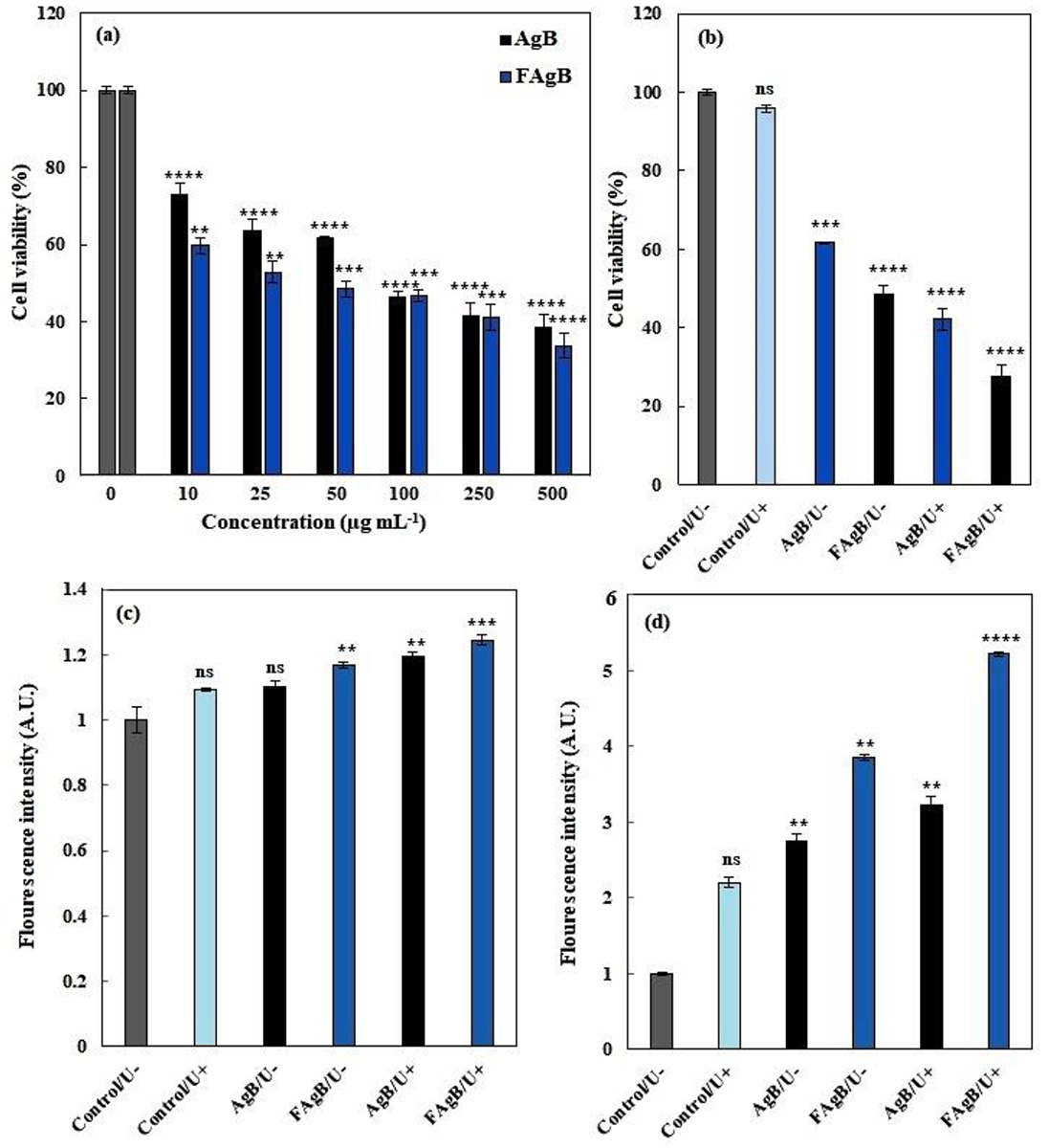 Figure 2. (a) And (b) In vitro viability percents of C540 cells treated in different groups (un-exposure of ultrasound (U) (a), and exposure of ultrasound (U) irradiation (b)); Fluorescence intensities of 2′,7′-dichlorodihydrofluorescein (H2-DCF) in control samples of silver-bismuth oxide nanocomposites (AgB NCs) and folic acid-functionalized counterparts (FAgB NCs) (50 μg mL−1) exposure of Ultrasound (U) radiation at 50% pulse ratios over duration of 5 minutes, presented in (c) under cell-free conditions and (d) within C540 cells. The error bars represent the standard deviations derived from three independent measurements. ** indicate significant differences (P-value=0.001), *** and **** indicates very significant differences (P-value<0.0001). The error bars represent the standard deviations derived from three independent measurements.