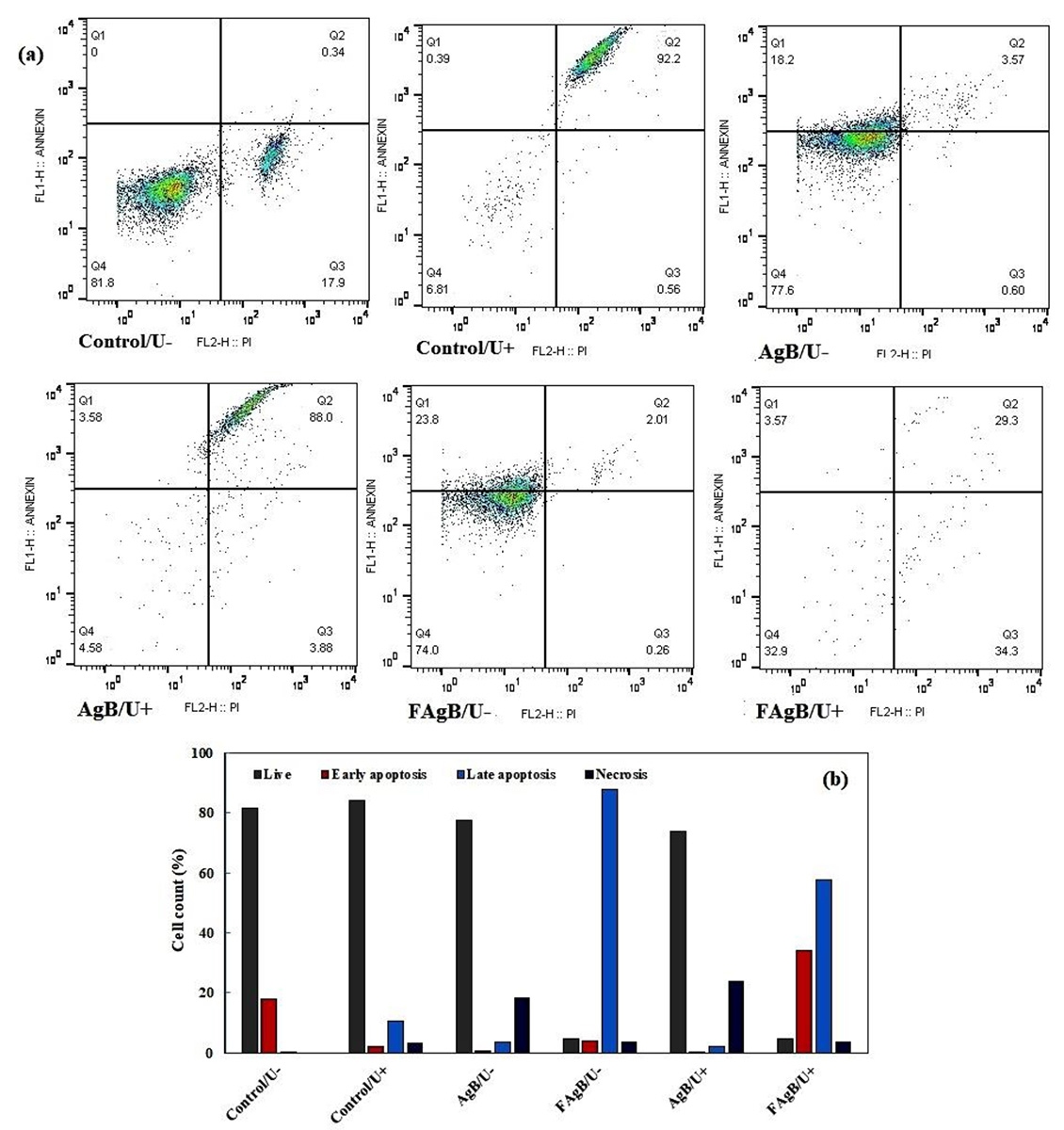 Figure 3. (a) Flow cytometric assessment of apoptotic impacts of silver-bismuth oxide nanocomposites (AgB NCs) and folic acid-functionalized counterparts (FAgB NCs) exposure and un-exposure of Ultrasound (U) radiation, and (b) The viability percentages of live, early apoptotic, late apoptotic, and necrotic of C540 cells across various treatment groups.