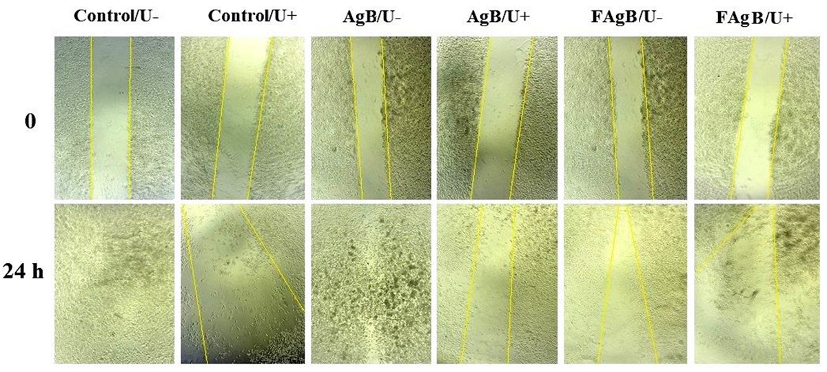 The scratch assay was conducted to assess cell motility after treatment with AgB and FAgB NCs (Figure 4). After 24 h, untreated control cells showed substantial wound closure, while cells exposed to NCs and U (especially FAgB/U+) demonstrated markedly reduced migration. The combined effect of U and NCs significantly inhibited cell mobility. Folic acid enhanced this inhibitory effect, possibly due to its role in modulating redox balance and cellular adhesion processes. These findings highlight the capacity of FAgB NCs to hinder metastatic activity in melanoma cells.