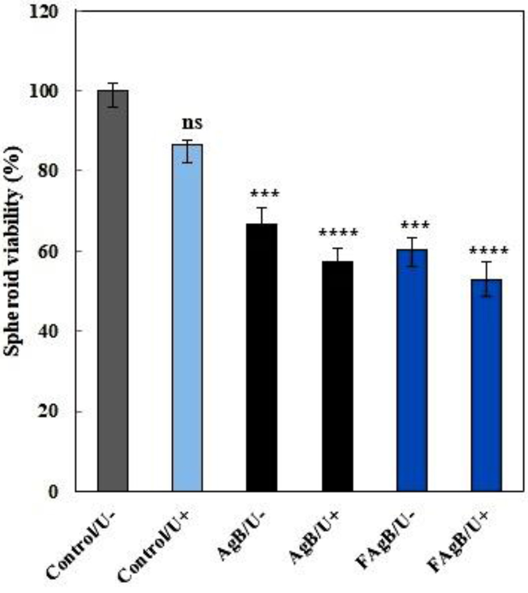 Three-dimensional (3D) spheroid cultures better mimic thin vivo tumor microenvironment. After 3 days of incubation, treatment with NCs led to significant decreases in spheroid viability. Viability reductions were 33.31% (AgB/ U-), 39.59% (FAgB/U-), 42.58% (AgB/U+), and 47.01% (FAgB/U+) (Figure 5). U exposure further amplified the therapeutic effect, likely via increased cavitation and localized ROS production. Folic acid functionalization also contributed to deeper nanoparticle penetration and enhanced apoptosis. These results validate the ability of FAgB NCs to suppress tumor growth in complex 3D models.