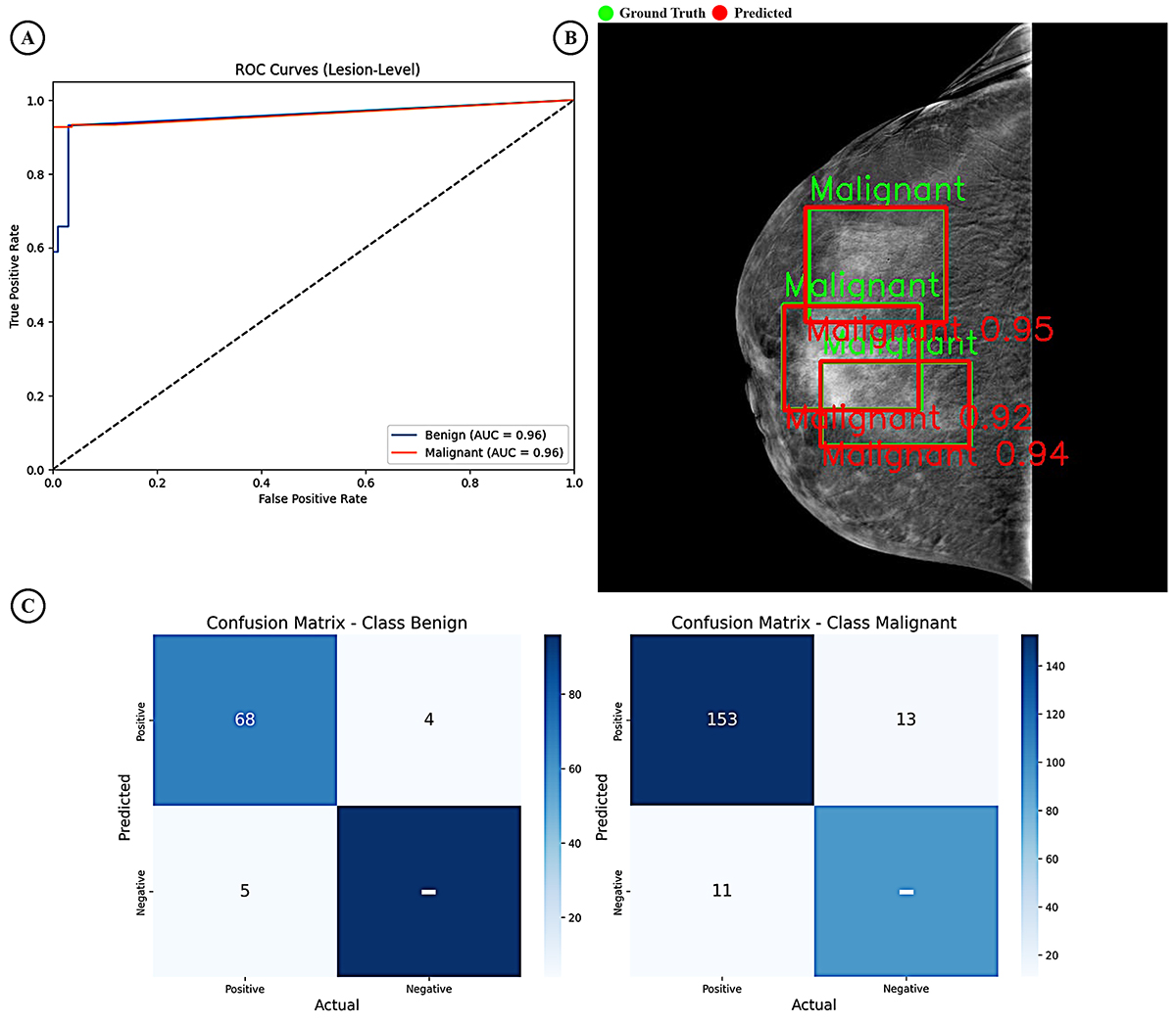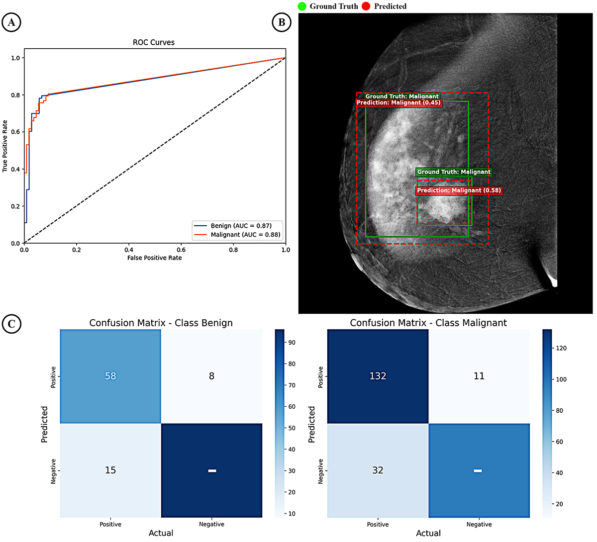 Figure 3. RetinaNet: (A) The Receiver Operating Characteristics (ROC) curves demonstrate Area Under Curve (AUC) values for the detection of benign and malignant lesions, indicating the model’s discriminative ability between these classes. (B) Representative mammography image demonstrating model predictions with bounding boxes and confidence scores. (C) Confusion matrices for lesion classification (left: benign, right: malignant), highlighting accurate identification of true positives and minimizing false positives.